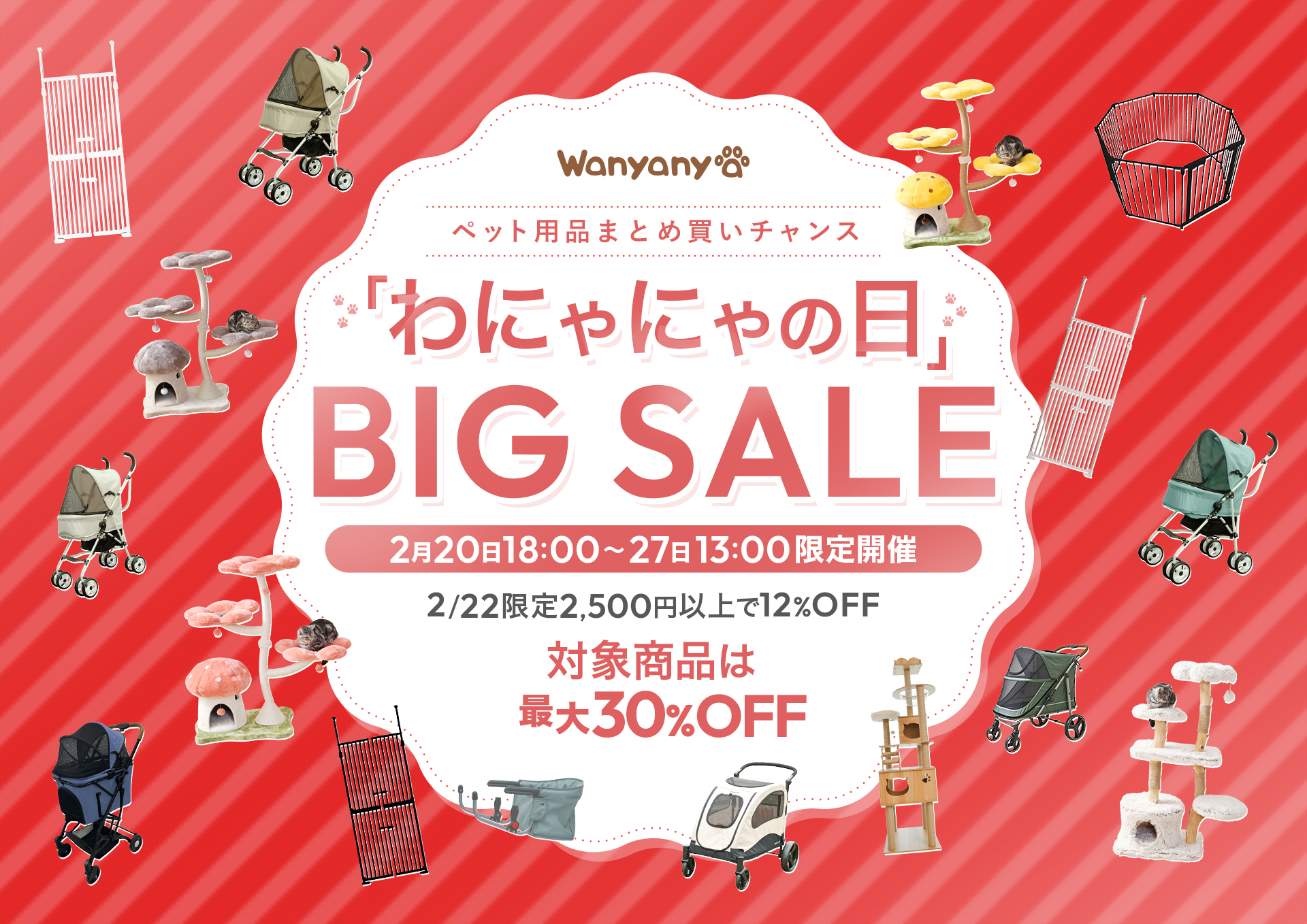 年に1度のWanyanya【限定】セール わにゃにゃの日 BIG SALE 開催! \ 対象商品は最大で30%OFF / 【30%OFF】セール対象のおすすめ商品6選をご紹介いたします!↓↓ にゃんドアクリア/ミスト¥19,460 コンフォータブルペットカートキャメル¥13,860 スチールペットサークル 8枚セットホワイト/ブラック¥13,700 ISOFIXペットキャリーカートミント/ナッツ¥27,860 木登りアスレチックタワー ハイタイプ¥13,700 木登りアスレチックタワー ワイドタイプ¥13,700 キャットツリーフラワーグレースノー/レッドスカーレット/イエローハニー¥25,300 キャットツリー自然木¥20,500 木登りアスレチックタワー ハイタイプ¥13,700 木登りアスレチックタワー ワイドタイプ¥13,700 ねこ脱走防止ゲートホワイト/クリーム/モカ/ブラック¥15,840 ねこ脱走防止ゲートクリア/ミスト¥19,460 おくだけラグズゲートブラウン¥11,960 MOGU (もぐ)チェアミント¥12,420 GUUU SLEEPS/L/TOWER ブラウン/グレー¥17,800 GOGO アルミバギー アイボリー/グレージュ/ミント¥11,680 ISOFIXペットキャリーカート ミント/ナッツ¥27,860 GOGO MEGAバギー ココナッツ/ミント¥25,300 コンフォータブルペットカートキャメル¥13,860 スチールペットサークル 8枚セットホワイト/ブラック¥13,700 セール対象外商品は 2/22わにゃにゃの日限定12%OFFクーポン を使ってお得にお買い物♬ ↓↓↓